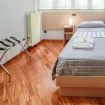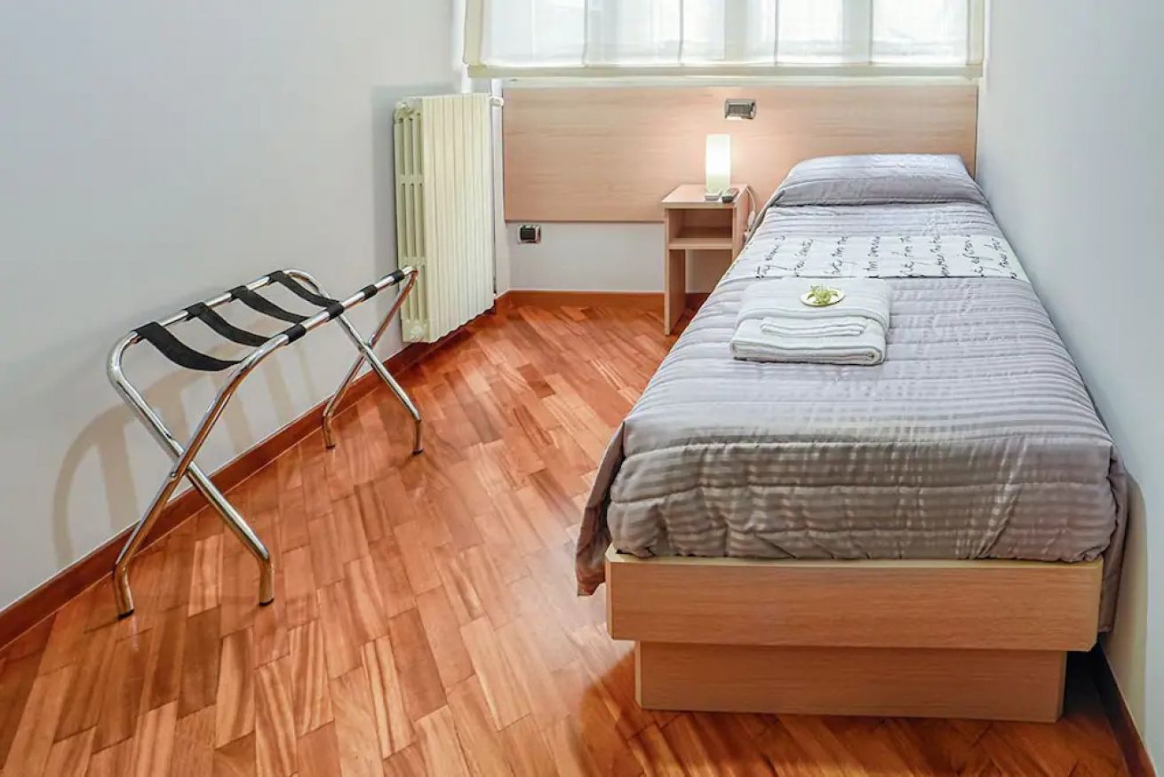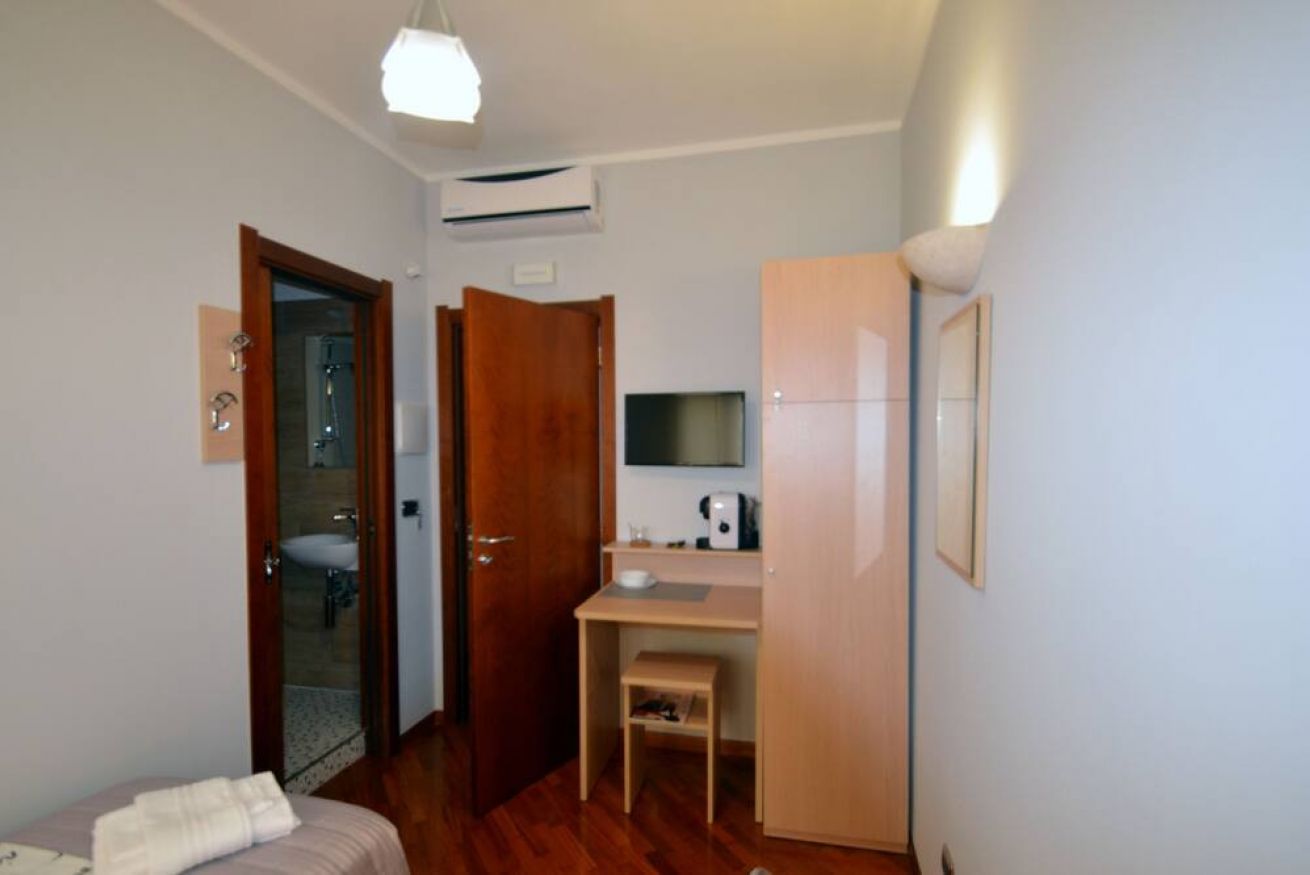 Piccola camera molto confortevole, com letto singolo stanfard, dotata di ogni confort: aria condizionata, riscaldamento, TV a schermo piatto, armadio con cassaforte, reggivaligia, phon, scrivania e comodino. In camera troverete la macchina per preparare a Vs. gradimento thè o caffè. Il parquet in massello doussiè rende l'ambiente molto accogliente. Il piccolo bagno è una vera chicca, con inserti di marmo portoghese.